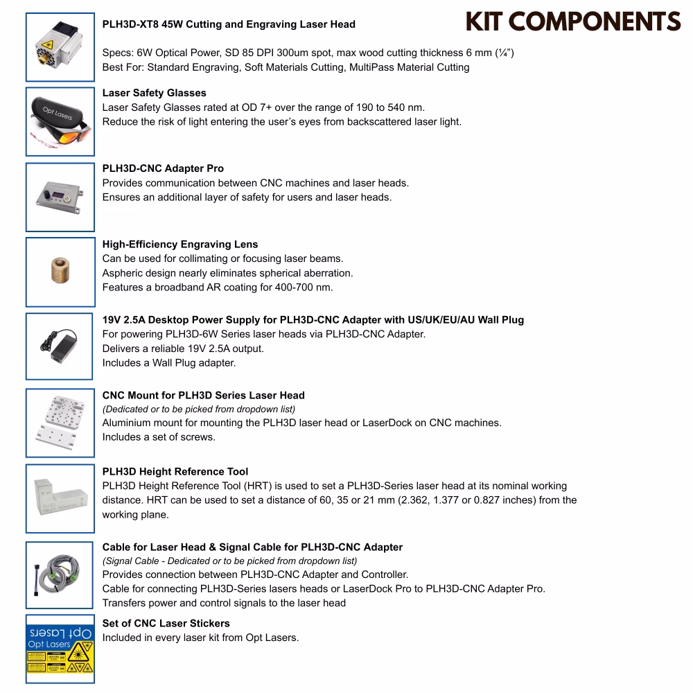 Всеки комплект е окомплектован с всички необходими компоненти, за да повишите възможностите на машината си без излишни усилия. Включени са лазерни предпазни очила за ваша защита, адаптер PLH3D-CNC за безупречна връзка и универсална алуминиева стойка, предназначена за лесно интегриране в различни платформи с ЦПУ. Ние правим още една стъпка напред, като предоставяме универсален сигнален кабел, сигнални проводници и захранващ блок, гарантирайки съвместимост с всеки CNC контролер, който може да имате.