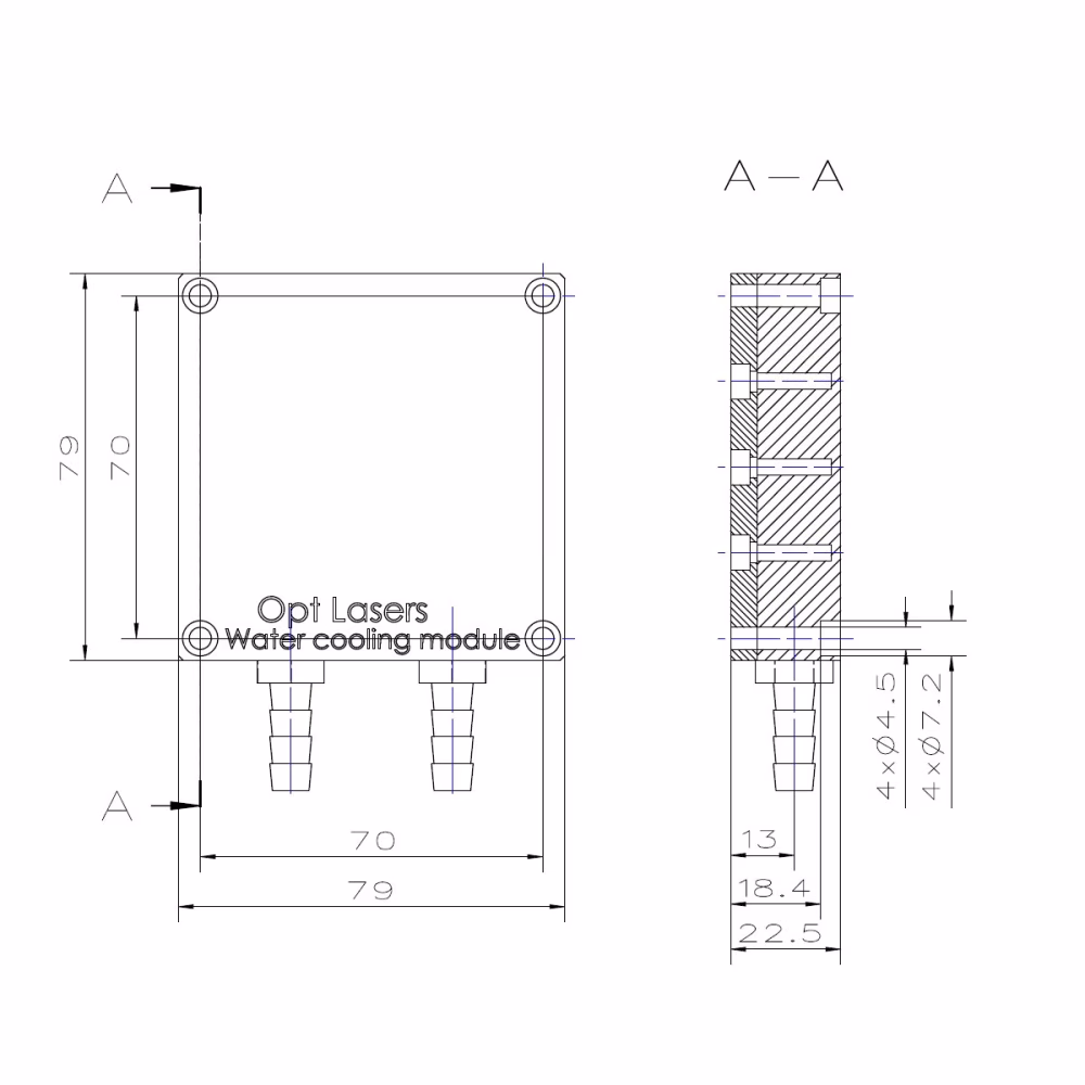 Чрез подаване на източник на охладена течност, като например чешмяна вода, течността циркулира в камерите на водния блок и ефективно абсорбира топлината от термоелектричните охладители (TEC) или електрониката. Алуминиевите плочи, обработени на ЦПУ, са надеждно свързани чрез седемнадесет винта M4 и уплътнителен O-пръстен. С вход и изход, разположени от една страна, модулът разполага с две месингови щуцерни връзки за маркуч.