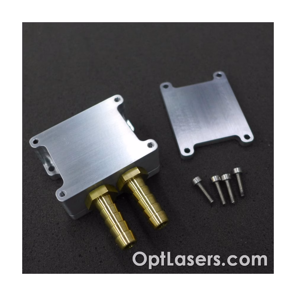 Přiváděním chladicí kapaliny, například z vodovodního řadu, kapalina cirkuluje v komorách bloku a účinně absorbuje teplo z TEC modulů nebo elektroniky. CNC obráběné hliníkové desky jsou pevně spojeny sedmnácti šrouby M4 a těsněním O-kroužkem. Obě hrdla pro vstup a výstup jsou pohodlně umístěna na jedné straně a modul je vybaven dvěma mosaznými hadicovými nátrubky. TEC modul není součástí dodávky.