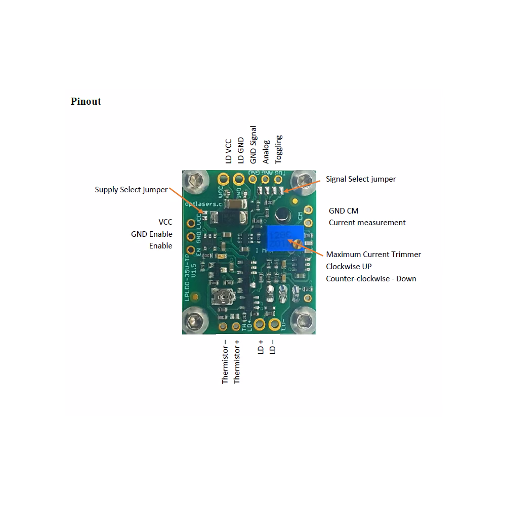Der Treiber muss mit einer Spannung im Bereich von 7,5 - 35 V DC betrieben werden und die Laserdioden müssen mit einer Versorgungsspannung im Bereich von 3,3 V - 35 V DC angeschlossen werden.