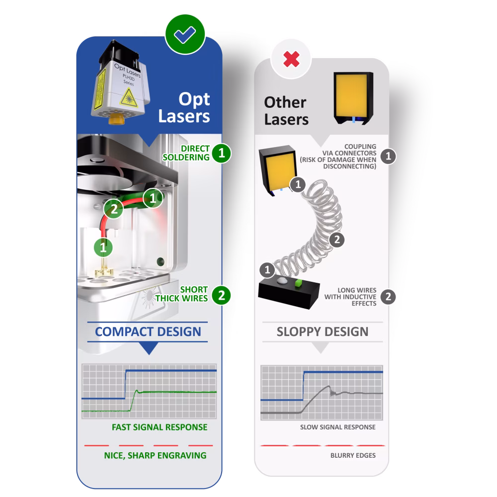 Driver integrato ultraveloce: Sperimenta prestazioni impareggiabili grazie al nostro driver integrato, che assicura incisioni precise e risultati affidabili. La stretta vicinanza dei diodi laser al driver consente la modulazione della corrente ad alta frequenza.