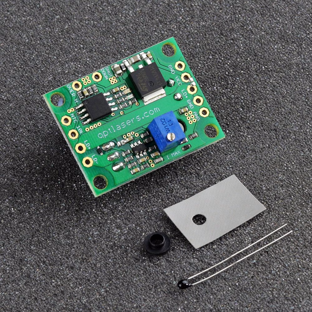 Driver per diodi laser monocanale 5 A 3,3-24 V con protezione termica. Sulla base di numerose richieste dei clienti, questa versione del driver LPLDD-5A-24V è dotata di protezione termica, che spegne il circuito del diodo laser se la temperatura supera i 45 gradi Celsius. Il sensore termico è incluso. LED aggiuntivi segnalano lo stato corrente del controller laser.