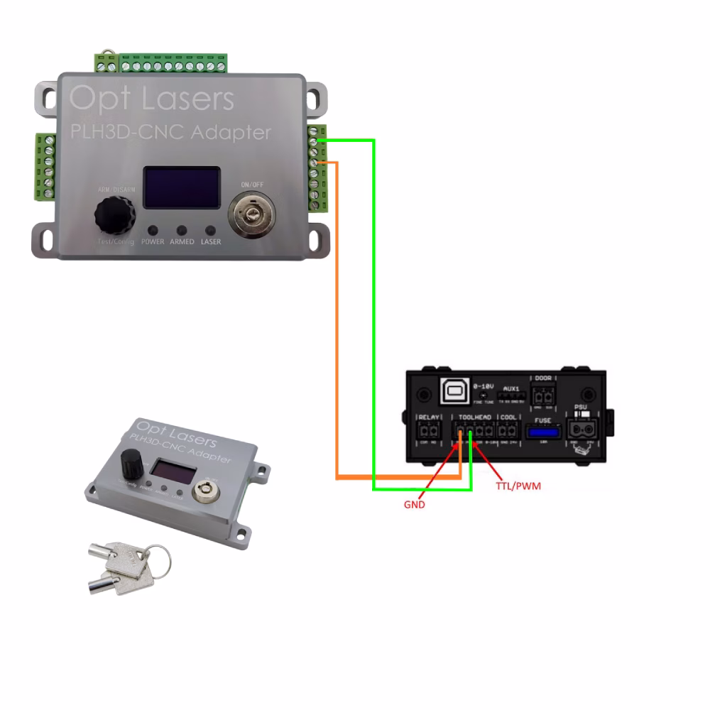 PLH3D-CNC 어댑터를 통해 PLH3D-6W 시리즈 레이저 헤드에 전원을 공급합니다.