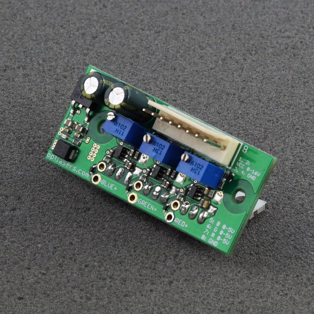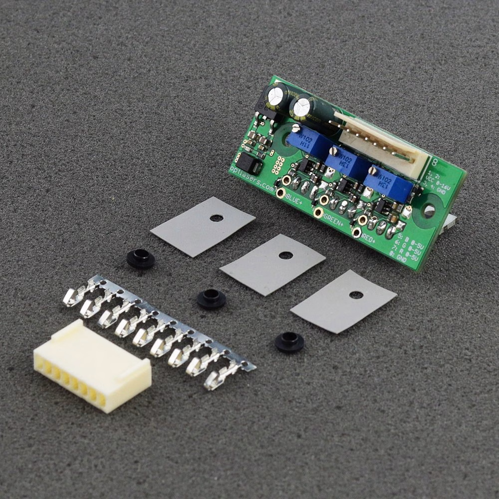 Oznaczenia na płytce prowadzące do kanałów „R”, „G” i „B” służą jako odniesienie przy podłączaniu diod laserowych. Istnieje możliwość zastosowania dowolnego kanału do dowolnej diody laserowej, co zapewnia elastyczność konfiguracji.