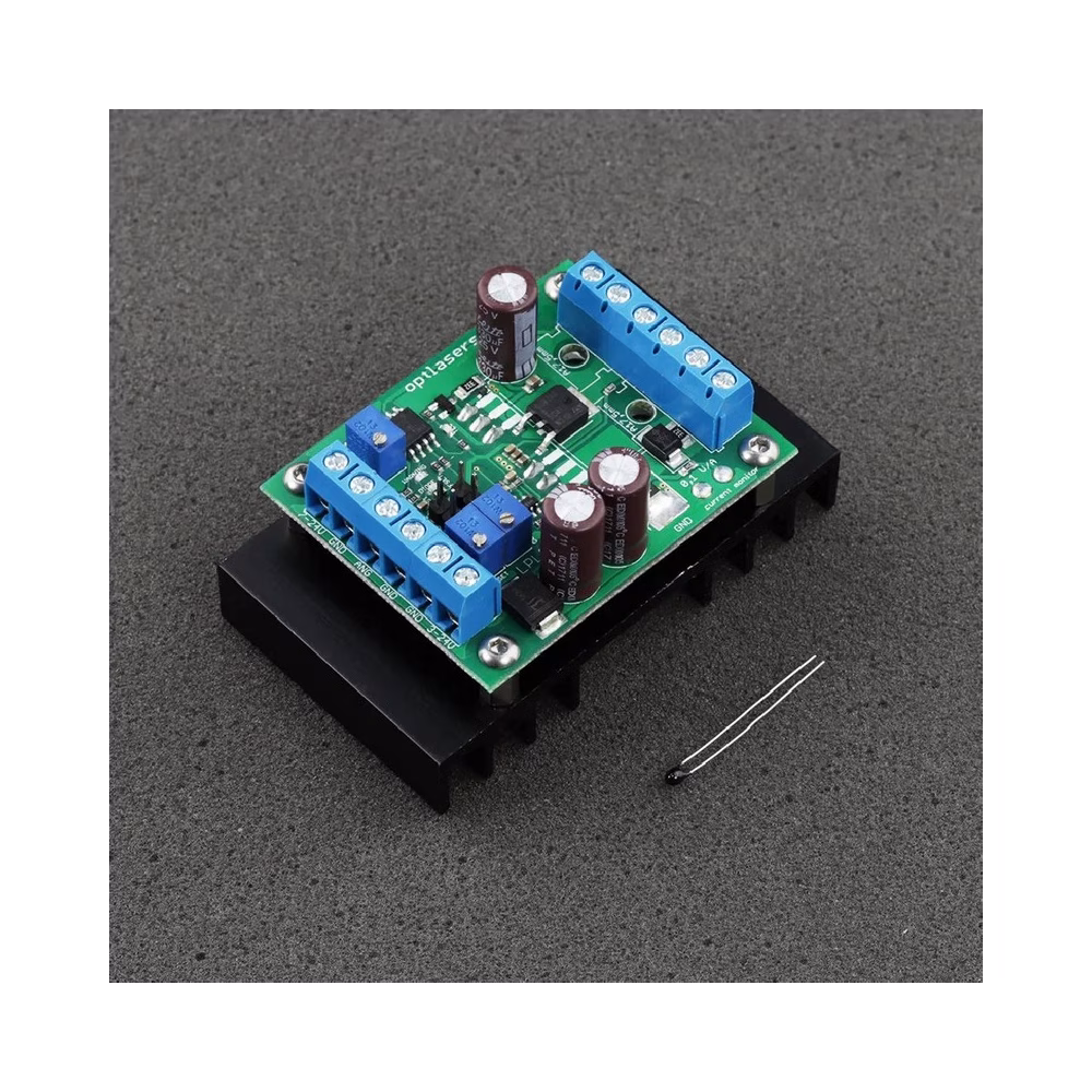 Linhas de diodos laser de qualquer comprimento de onda podem ser alimentadas com tensões de 3 V até 24 V. A entrada analógica possibilita a modulação da corrente através dos diodos laser até 100 kHz. O driver é equipado com saída de monitor de corrente, fornecendo um ponto de medição conveniente para monitoramento do fluxo de corrente no diodo. Dois potenciômetros são fornecidos para ajustar a corrente máxima do diodo e a corrente de polarização. O terceiro potenciômetro é responsável por definir a temperatura de referência na faixa de 0 – 40 graus Celsius.