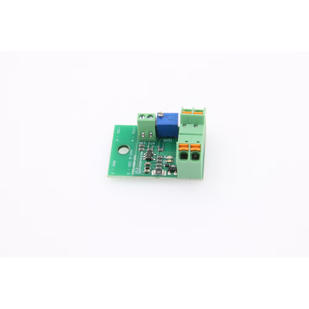 Compact size and big operating currents make it possible to use this driver in almost any project. Thanks to built-in MOSFET users don't have to apply thermal compound and heat sink. Additional mounting holes, as well as wires connectors, make assembly of the controller even easier. Temperature stabilization reaches +-0.4 degrees Celsius accuracy. High current, wide voltage range and high accuracy in a device of only 20 x 30 mm in size! The driver works in cooling mode and uses voltage feedback from an NTC thermistor. One 10k NTC B3950 thermistor is shipped with the temperature controller. It is possible to upgrade the controller to 36V maximum input voltage. A maximum current flowing through the device depends on the TEC used. Voltage dropout on a driver is very small so current can be predicted by reading TEC labels. For example, 12704 means 12 V and 4 A. 12715 means 12 V and 15 A.